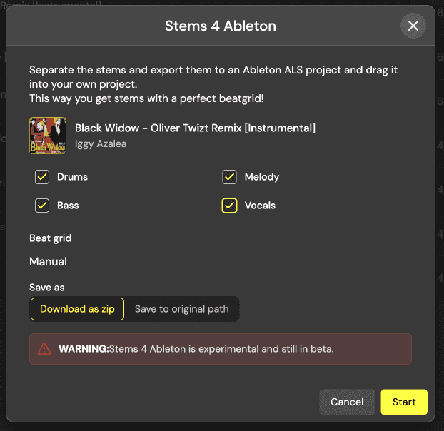 From inside the library, you can just right-click a track, and you will see the "Stems 4 Ableton" option. Click this to create a pack of stems (drums, bass, melody, vocals).Â