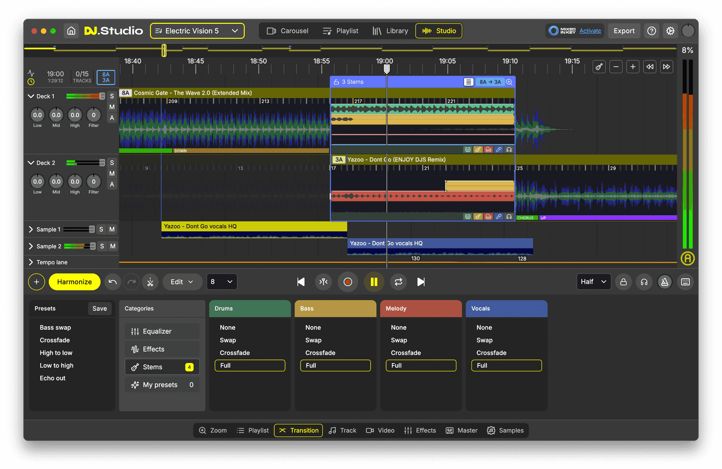 Remove Clashing Elements: Are the powerful basslines of two tracks clashing during a mix? Simply use the editor to automate a reduction of the bass stem from one of the tracks during the transition, ensuring a clean, punchy low-end without any muddiness. This level of control is transformative for achieving pristine sound quality.