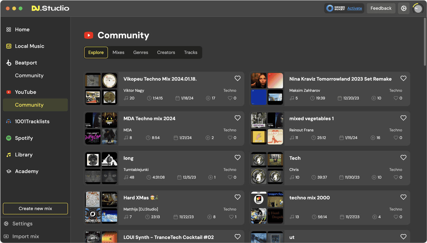 Another neat way to discover new music is by checking out the community mix page. You can browse thousands of mixes made by the community and pick through their tracklists. If you find tracks that you like in a mix, simply hit the âFavoriteâ button to save it to your library. Then you can quickly add them to your own mix