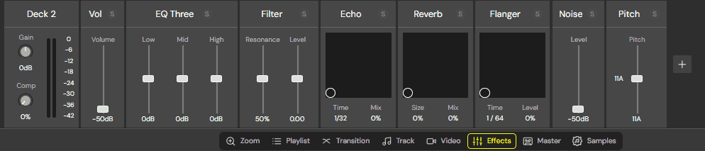 EQ is another process which wouldn't often be called an effect, but I think it still counts as one. This lets you change the balance between the low, mid, and high frequencies of your tracks. This can be used to make space during transitions to prevent clashses and emphasize sounds, but there are other uses.