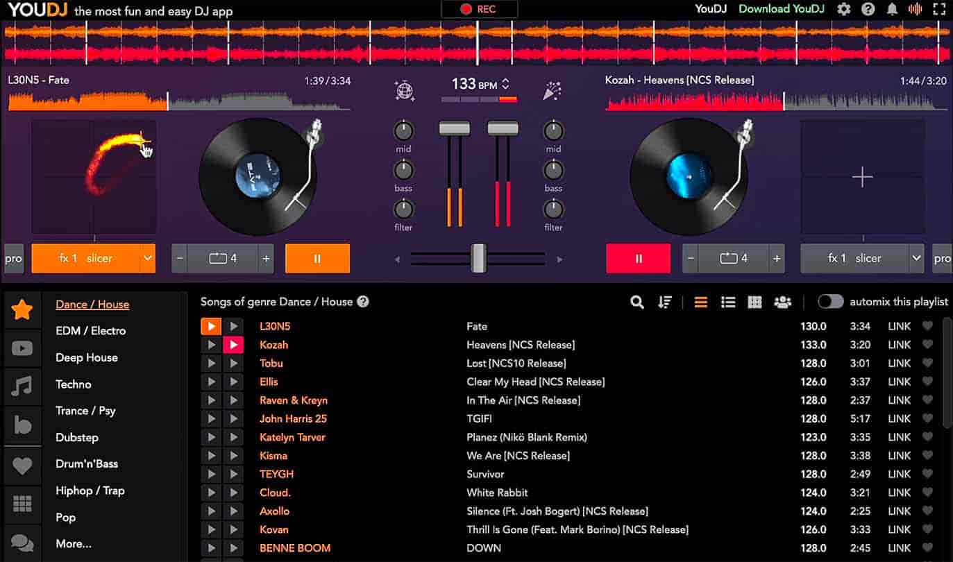 YouDJ - This free online DJ mixer has a very familiar deck-style interface and connects with streaming platforms. It even features realistic vinyl scratching, but it is a bit buggy, being made by a solo programmer.