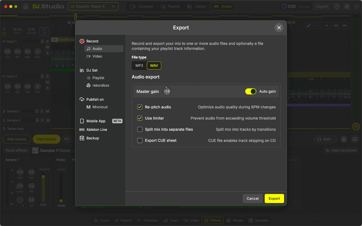 Exports to WAV/MP3, video with visuals/track info, Ableton Live, and DJâset playlists you can load in live software.