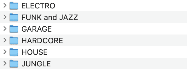 The best strategy is to stick to some kind of layered organization system. Especially when you're DJing, this makes it easy to find specific music, but also to inspire your next step by sticking to specifications.