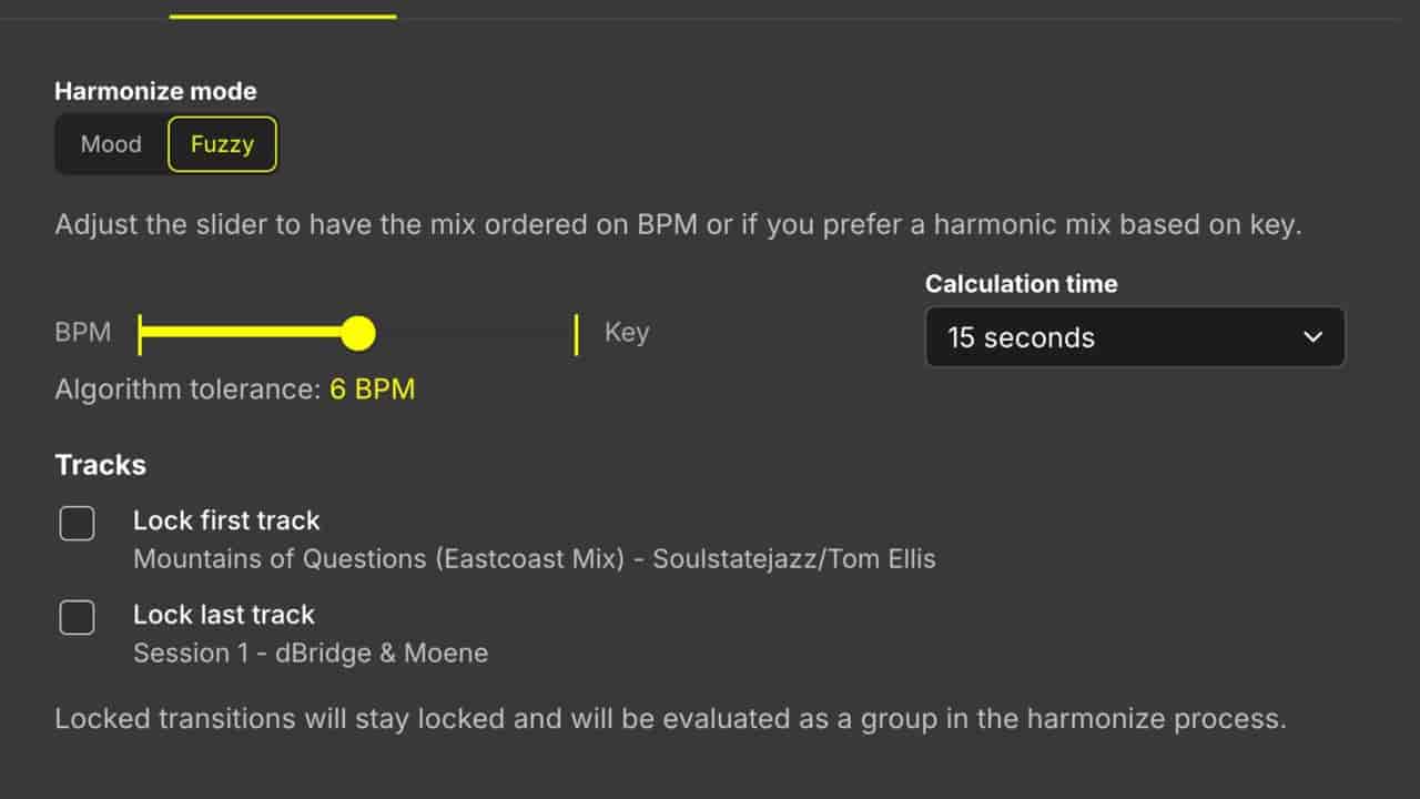 Click Harmonize - DJ.Studio analyzes the BPM and key of every track in your playlist and intelligently reorders your set based on your chosen balance between tempo and harmonic compatibility. You can fine-tune the result using Mood or Fuzzy mixing, set BPM tolerance, lock your opening or closing tracks, and control how strictly the algorithm follows BPM versus key. The result is a smoothly flowing, harmonically coherent DJ set without manual calculations or guesswork.