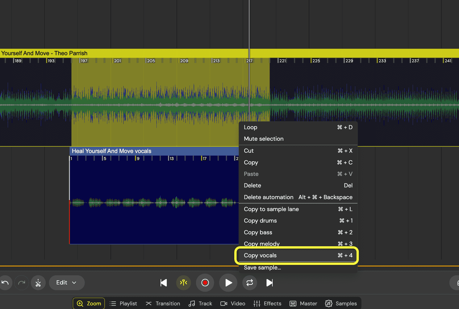 Caption: After selecting a region, right-click → Copy vocals places an isolated vocal clip on the Sample Lane.