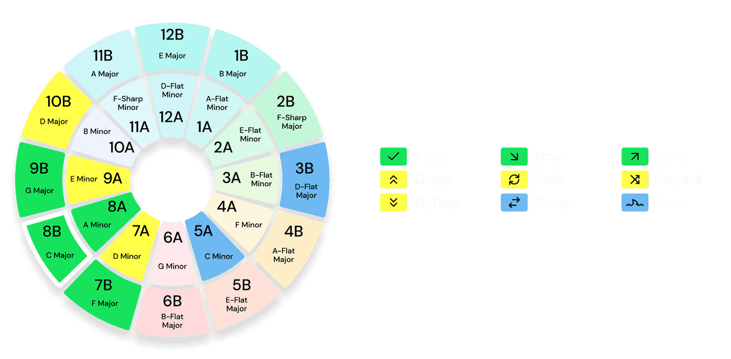 Additionally, you can use harmonic DJ mixing to control the energy levels of mixes as you transition between each song. The relationships between different keys create certain energy transition feelings. For example, some key changes create a perceived increase in energy, while others bring the energy level down.