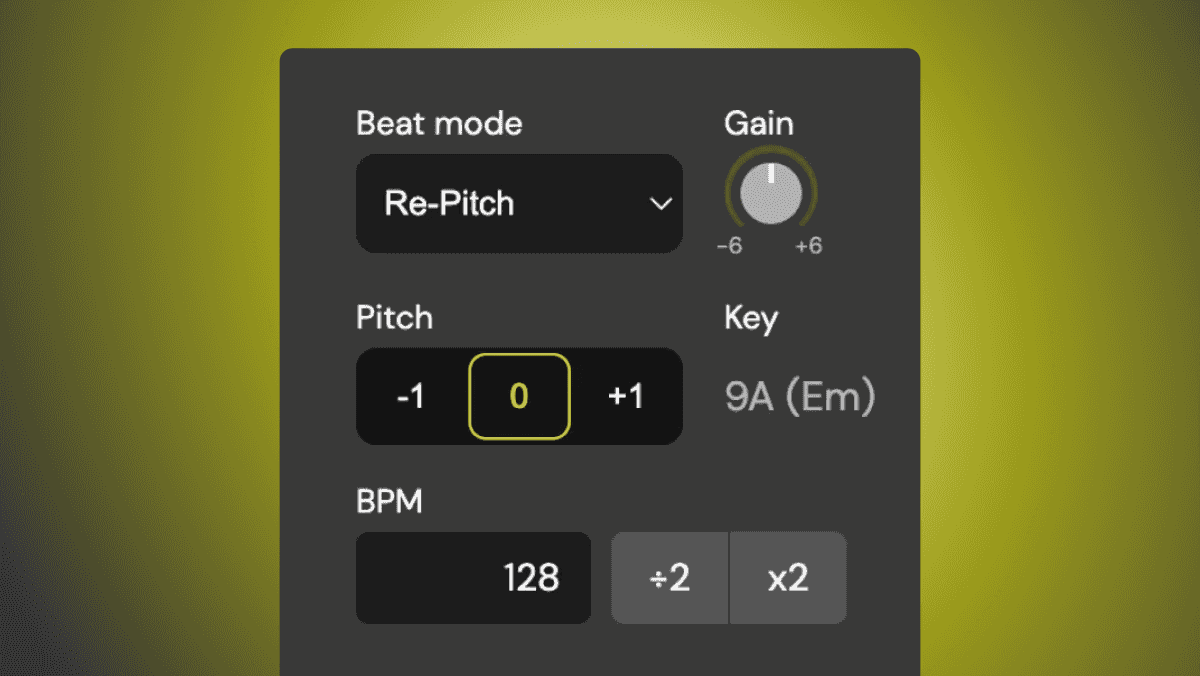 Choose Pitch Mode: Re-Pitch to keep BPM steady, or Vinyl to let tempo follow pitch.
