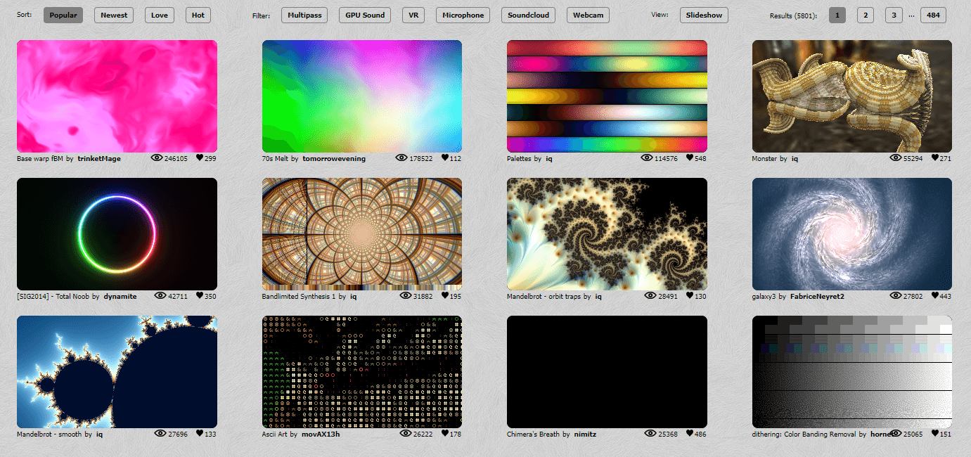 The platform has a very large library of Shadertoys, including many community-created shaders that can be explored and reused depending on their visibility and licensing settings.