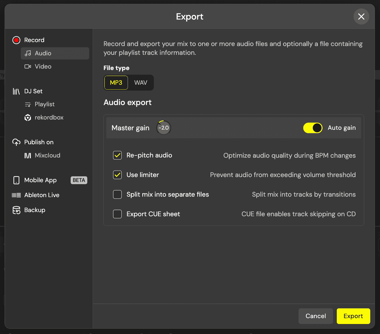 After isolating and manipulating the stems, export the finished audio samples to use in other projects or DJ software; they can be exported in supported formats such as WAV or MP3.