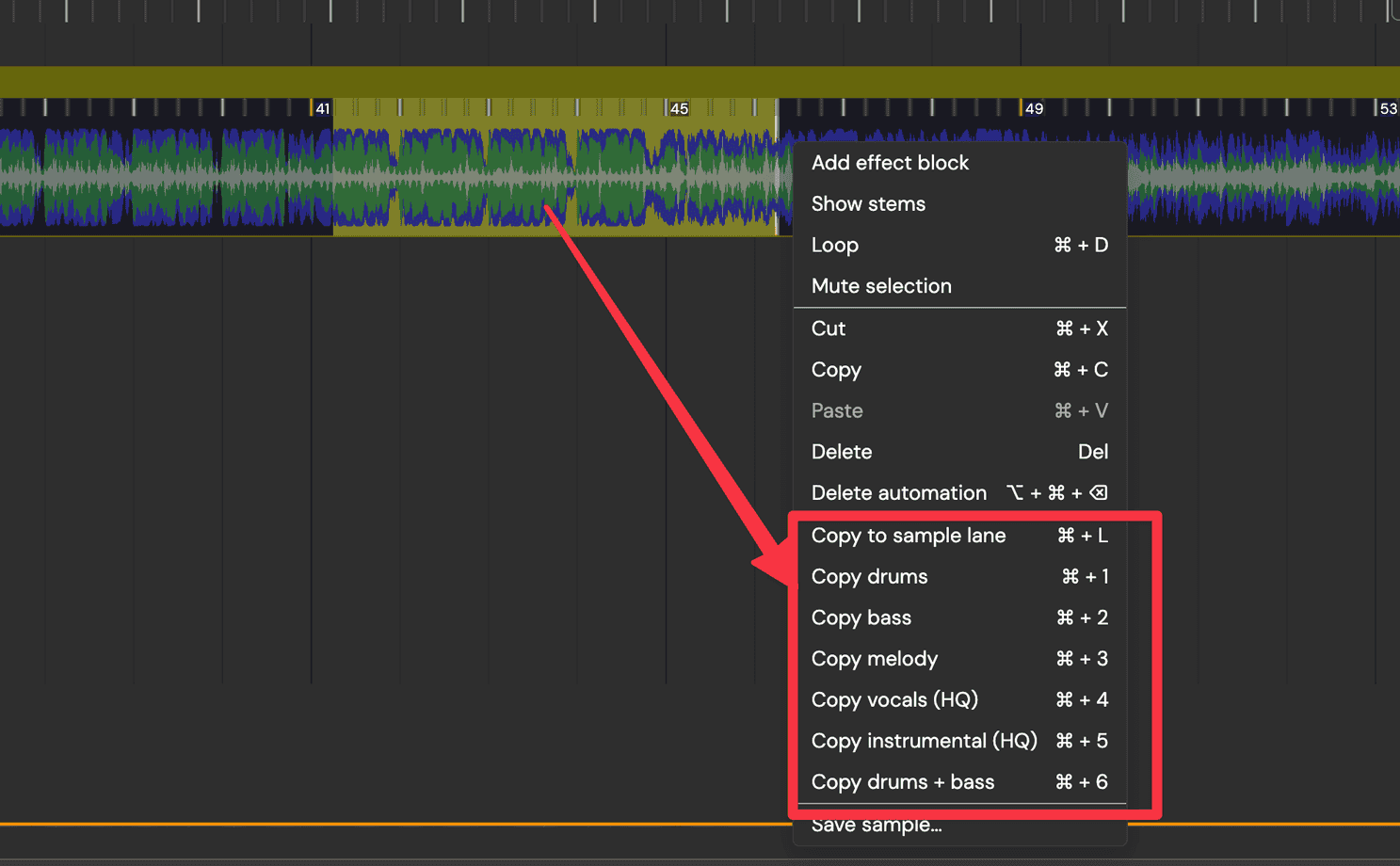 Copy Drums: Isolates the specific drums and percussion in the selected region.