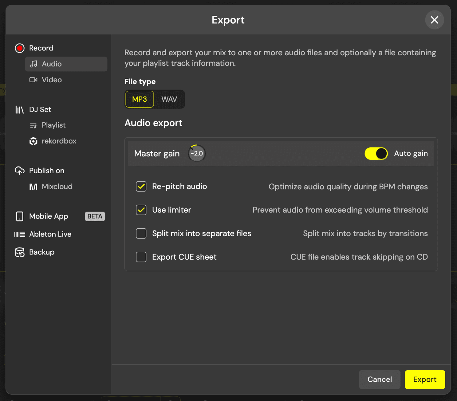 Click Export in the top right of the Studio screen and you get six tabs: Record (Audio / Video), DJ Set (Playlist / rekordbox / Serato), Publish (Mixcloud), Mobile App, Ableton Live and Backup. Each tab is tuned to a specific use case.
